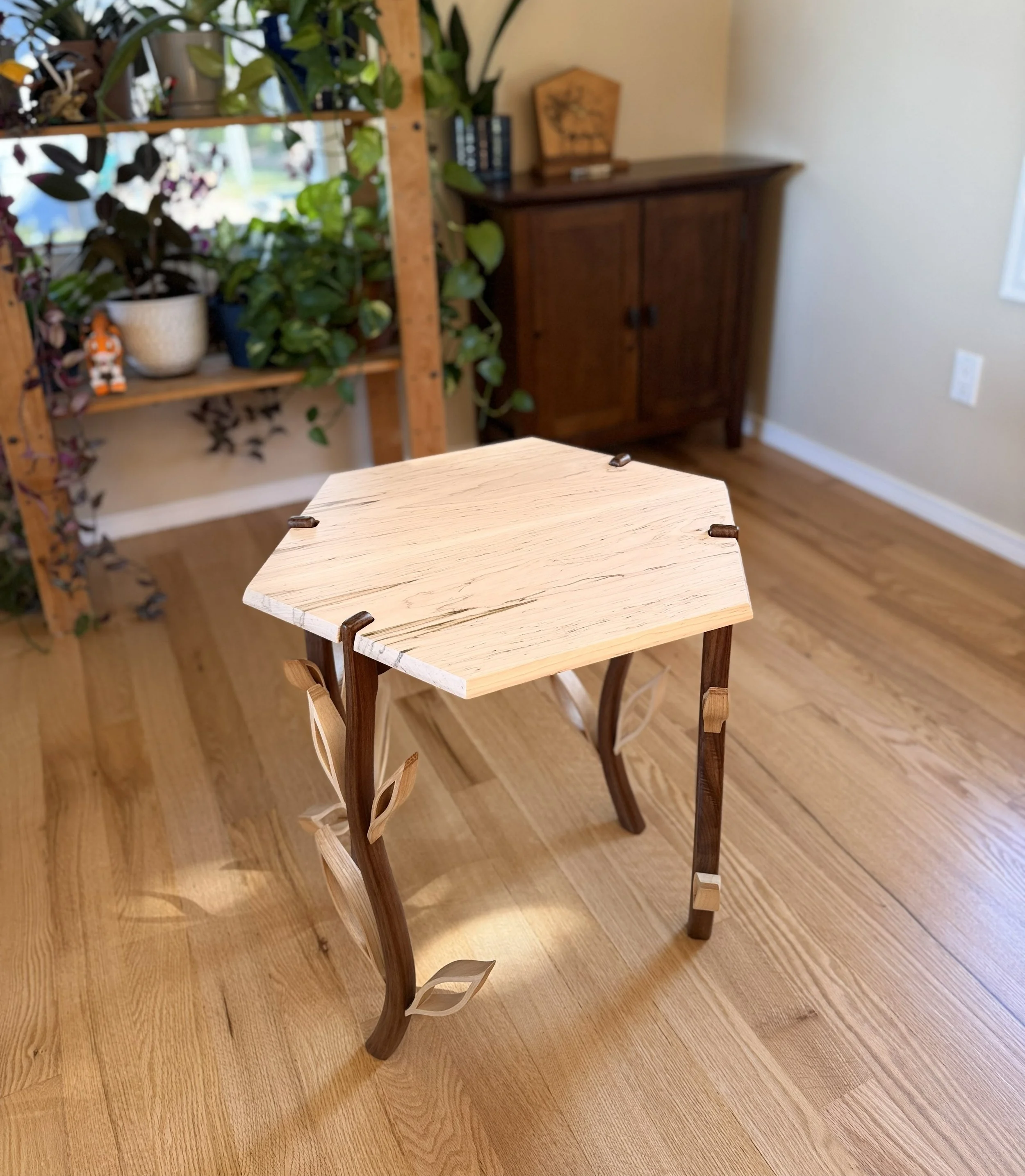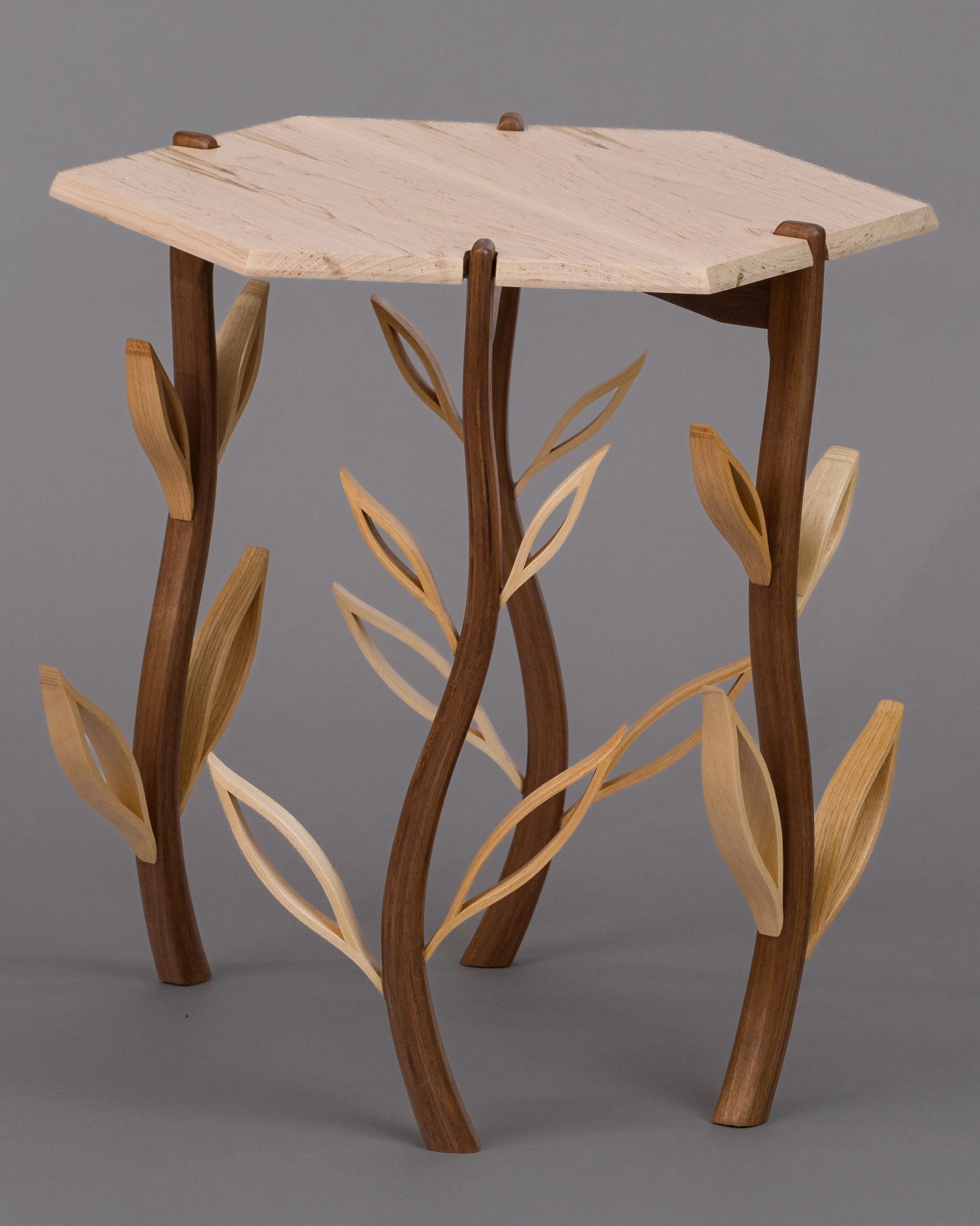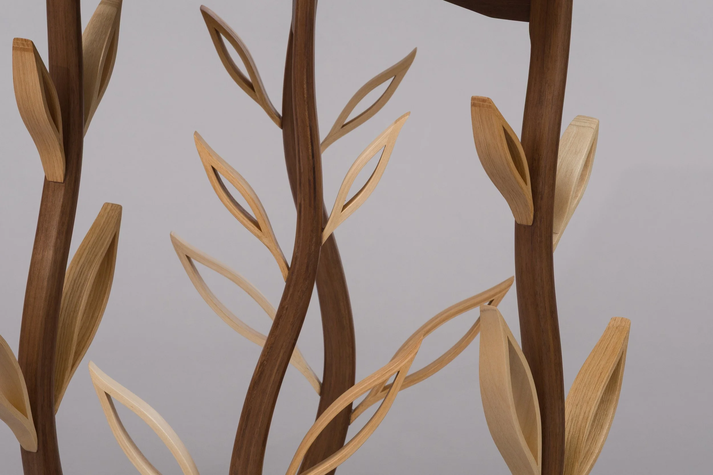 Emerging from each leg are delicately shaped leaves, themselves bent and joined with scarf joints for continuity and grace. Crafted from birch and hickory, the leaves offer subtle shifts in color and tone that catch and play with the light, adding movement as the piece is viewed from different angles.